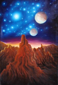 Am realizat aceasta pictura acum cativa ani dar acum a trebuit sa inlocuiesc figurile umane care nu se incadrau deloc in peisaj cu acesti munti stancosi ce se inalta spre roiul de stele albastre de mare energie care lumineaza cerul noptii