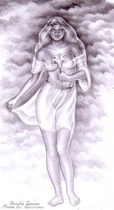 Aceasta este muza lui Mihai Eminescu, asa cum mi-am imaginat-o dupa ce am citit poezia „Aveam o muza”, una dintre multele poezii pe care Eminescu le-a scris dupa moartea fetei cu parul de aur din Ipotesti care a fost prima si marea lui iubire. Asa mi-o imaginez eu pe blonda din Ipotesti care i-a marcat aproape toata creatia poetului, o fata atat de frumoasa, atat de dulce, atat de pura, ca un inger venit direct din rai. Contrar a ceea ce se crede in ziua de azi nu Veronica Micle a fost muza lui Eminescu ci aceasta fatuca nevinovata din satul lui natal care la doar 19 ani a murit rapusa de dropica.Durerea poetului s-a pastrat in creatiile lui si m-a marcat si pe mine. Dupa ce am citit poeziile lui Eminescu desi nu am cunoscut-o niciodata pe aceasta fata minunata m-am indragostit si eu de ea si am simtit si eu durerea pe care a simtit-o poetul cand a pierdut-o. Muza lui Mihai Eminescu seamana foarte mult si cu muza mea numai ca a lui a murit iar eu nu am intalnit-o si nici nu stiu daca o voi intalni vreodata pe a mea caci EA este doar o creatie a mintii mele, o Galatee pe care o creez in fiecare desen sperand ca intr-o zi Afrodita va transforma visul meu in realitate si imi va scoate muza in cale.