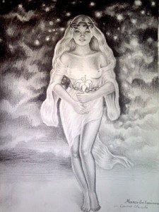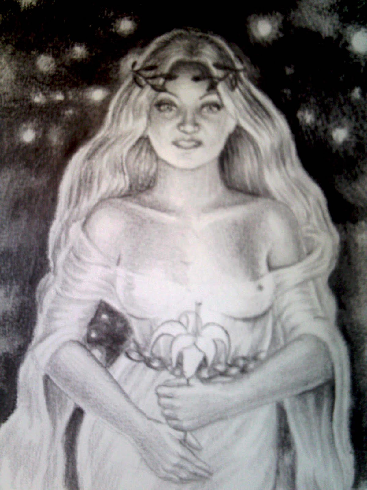 Acesta este cel mai nou desen reprezentand-o pe fatuca cu parul de aur din Ipotesti care a fost prima iubire si muza a lui Mihai Eminescu. In acest desen in creion si carbune am incercat sa pun pe hartie chipul ei curat, aspectul ei angelic, frumusetea ei divina, asa cum mi-am imaginat-o eu dupa ce am citit poezia „Aveam o muza”. Aceasta poezie a fost scrisa dupa moartea tragica a acestei tinere fete. Acest inger cu chip curat de fata s-a stins prea repede lasandu-l pe poet atat de indurerat. Prima iubire nu se uita niciodata si nici Eminescu nu a putut sa o uite pe aceasta fata simpla dar minunata din satul lui natal cu care se intalnea seara si se plimba prin codru, pe sub teii infloriti, pana la lacul incarcat cu nuferi galben ce stralucea in lumina lunii. Nu Veronica Micle a fost marea iubire a poetului ci aceasta fata care se zice ca era fiica lui Gheorghe Alupului si o chema Casandra Elena desi in doua dintre poeziile lui Mihai Eminescu pomeneste numele Marta. Aceasta copila inocenta cu parul de aur moale apare in foarte multe dintre creatiile poetului, nici Veronica Micle neputand sa stearga imaginea ei care aparea mereu in minte poetului ca o fantoma din trecut. Aproape in fiecare poezi scrisa de eminescu s-a pastrat cate o parte din aceasta fiinta, cate ceva al ei. Aceasta fata era o fata blonduta, cu ochii cel mai probabil albastrii, frumoasa, curata la suflet, iubitoare, fidela. Ea daca ar fi trait ar fi fost in stare sa stea langa omul iubit si sa-l faca fericit toata viata. Ea ar fi fost femeia cu care Eminescu ar fi putut sa-si intemeiezde o familie. Desi nu am cunoscut-o decat din poeziile lui Eminescu si eu am ajuns sa ma indragostesc de ea si sa-mi doresc sa fiu cu ea si sa desenez si sa pictez chipul ei angelic, trupul ei de zana imaginandu-mi ca sunt eu cu ea, in locul poetului, ca e aici cu mine, ca e real. Cine nu si-ar dori un asemenea inger, o fata atat de frumoasa, atat de pura si cu un suflet atat de curat?