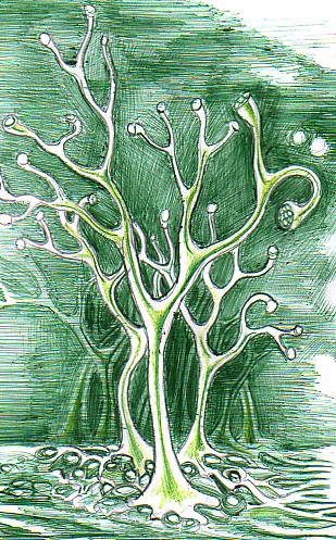 Aceasta este Rhynia, prima planta de uscat de pe Pamant, o planta care masura 18 cm si nu avea frunze si nici flori ci doar o tulpina ramificata. Rhynia a aparut in devonianul inferior, acum 400 de milioane de ani.