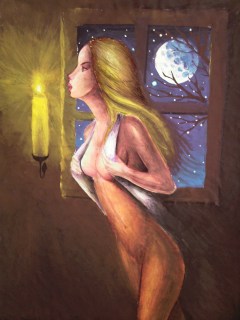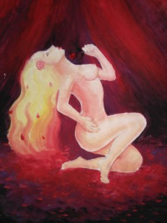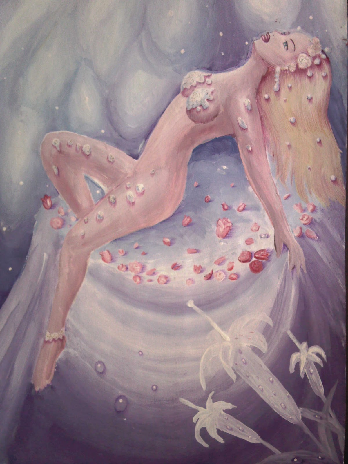 Tot atunci am avut o perioada cand imi placea foarte mult albul si o vedeam pe EA blonda, cu flori albe in par, imbracata intr-o rochie alba semitransparenta tinand in mana un buchet de crini albi sau goala corpul ei fiind acoperit de frisca si de petale de flori albe, stand pe un pat de matase alba intr-un decor alb