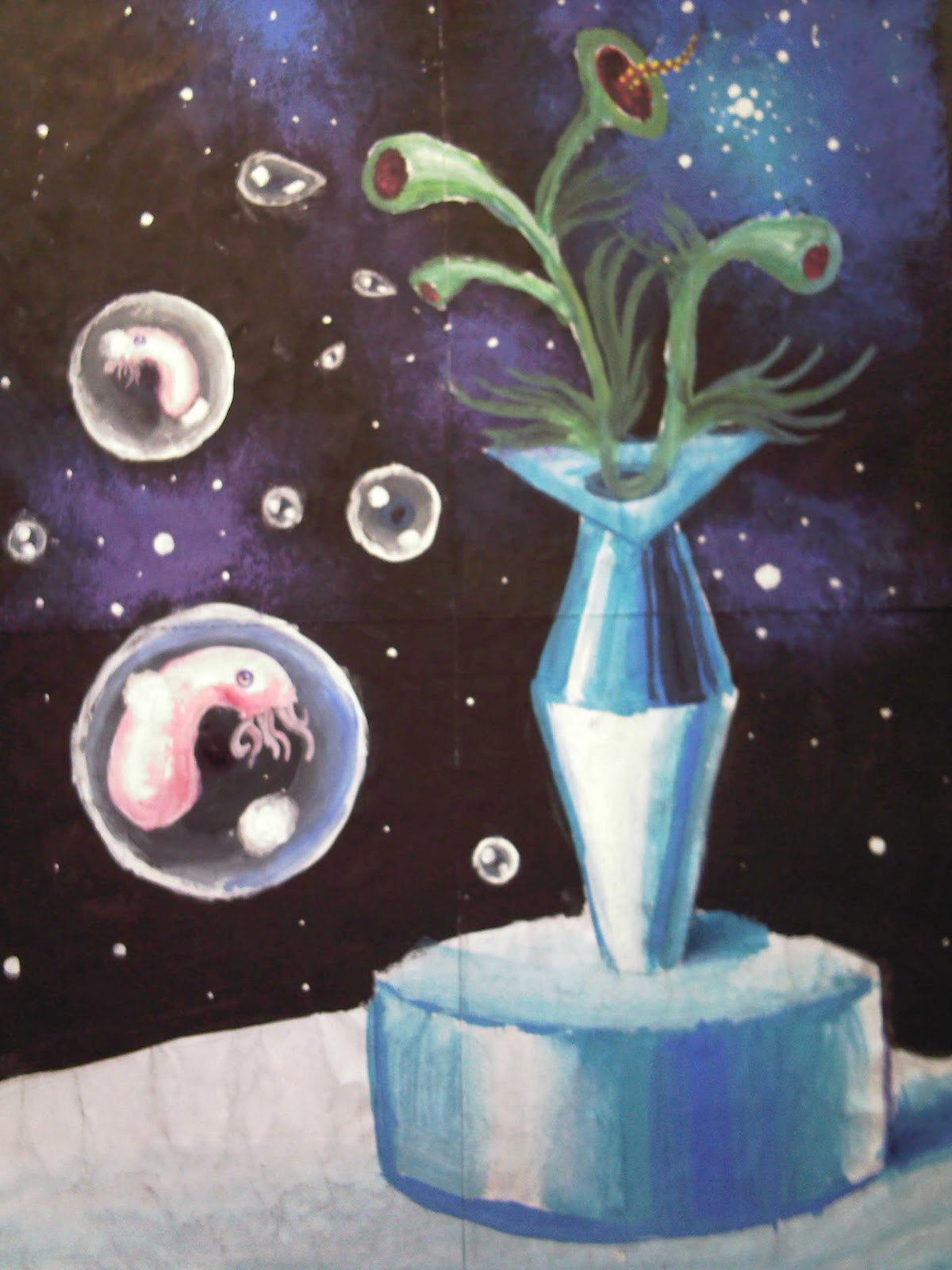 O planta si niste animale extraterestre undeva in cosmos, undeva unde nu exista gravitatie si animalele subacvatice traiesc in sfere de apa