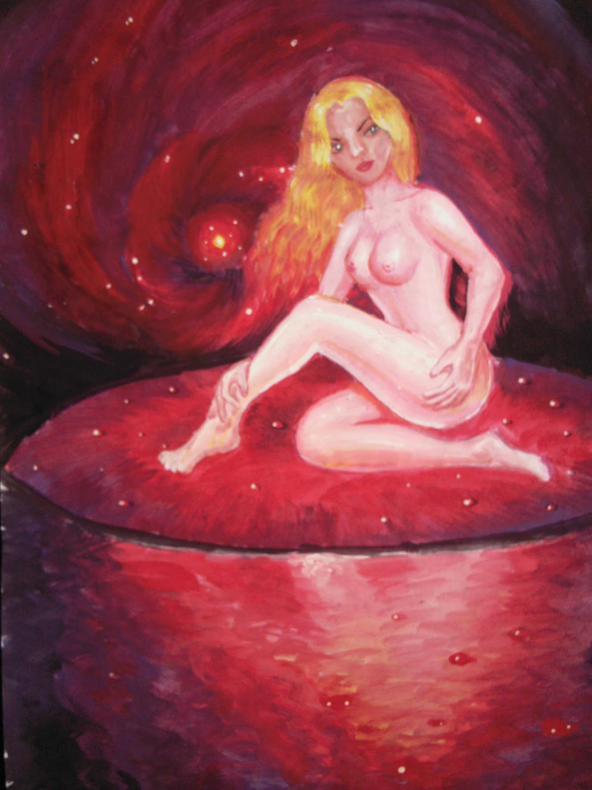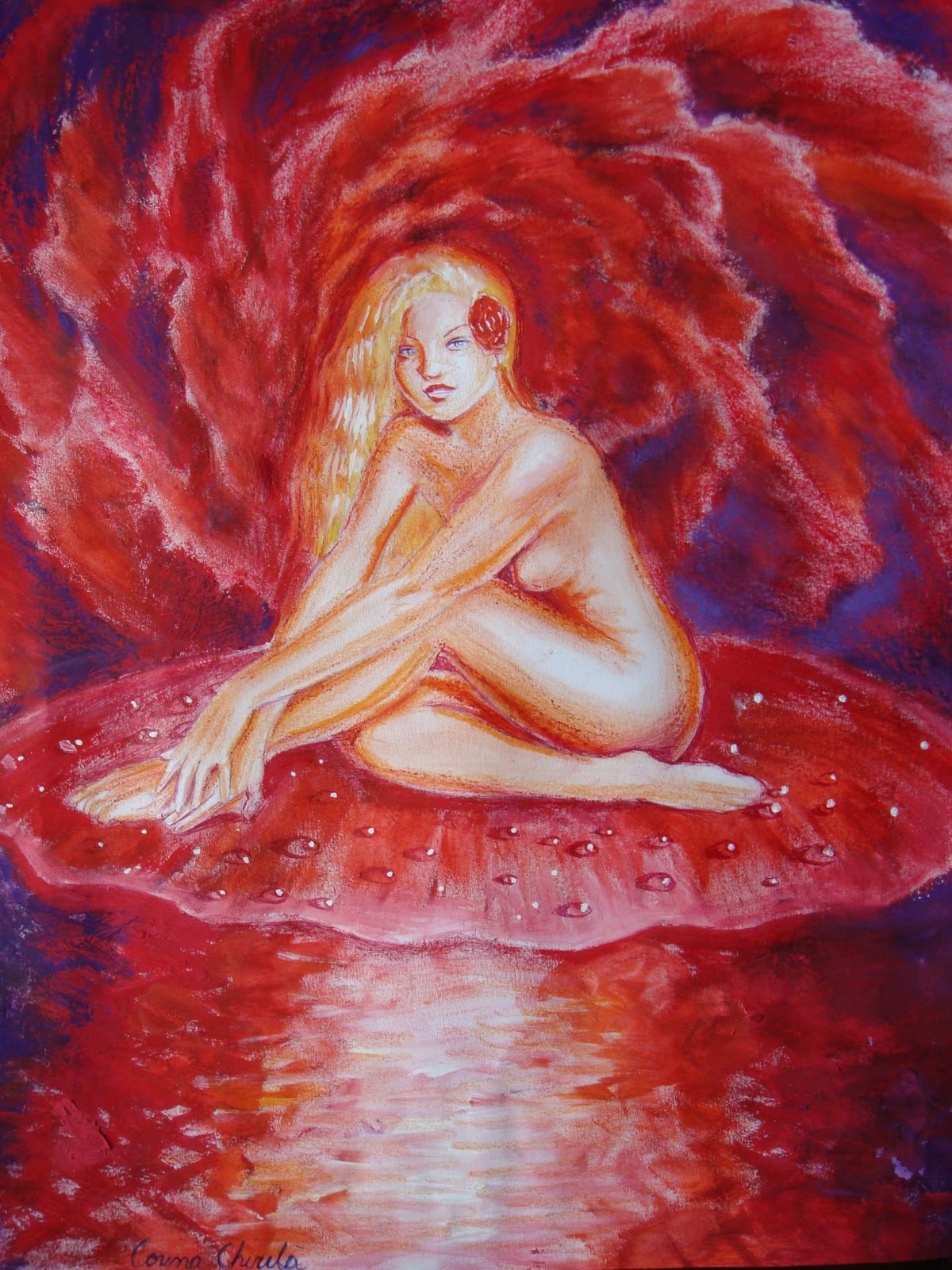 Aceasta este imaginea unui ideal feminin, o Eva ce emana senzualitate, feminitate dar si naturalete si puritate stand goala asa cum a facut-o natura pe o imensa petala de trandafir rosu ca pasiunea, ce pluteste pe un ocean de stralucire. Am folosit mult rosu si am pus un trandafir rosu in parul ei blond si lung si in fundal pentru a accentua senzualitatea picturii, trandafirul rosu fiind unul dintre sibolurile iubirii pasionale.
