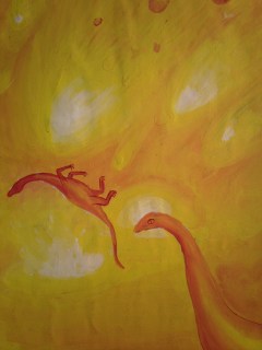 Nu se stie exact ce anume a dus la disparitia dinozaurilor dar se presupune ca catastrofa din cauza careia acestia au disparut acum 60 de milioane de ani a fost provocata de un asteroid care a cazut pe pamant. In imaginea de mai sus este unul dintre desenele mele reprezentand un dinozaur care priveste neputincios dezastrul iar mai jos sunt niste picturi de acum 8 ani avand ca tema catastrofa care a dus la disparitia dinozaurilor.