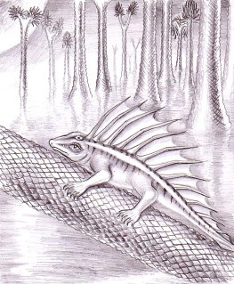 Desenul de mai sus si pictura in acuarela de mai jos au fost realizate acum doi ani si reprezinta un stegocefal (Stegocefalii au fost niste amfibieni din carbonifer, primele vertebrate care au parasit mediul acvatic) coctat pe un trunchi de lepidodendron (Lepidodendron a fost un arbore care alaturi de sigillaria si alte licofite popula zonele mlastinoase care erau foarte raspandite pe planeta noastra in carbonifer) prabusit.