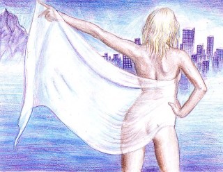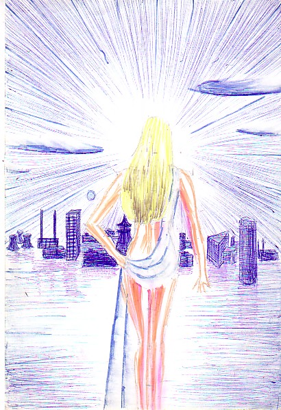 Acesta este un desen pe care l-am realiat cand aveam doar 14 ani imaginandu-mi ca sunt eu cu femeia pe care o iubesc in lumina diminetii, dupa o noapte de iubire. Ea priveste orasul cu cladiri moderne ce se inalta undeva departe, dincolo de ocean iar eu o privesc cat de frumoasa, de matura si de puternica e cu parul ei blond si rebel nici prea scurt nici prea lung, cu corpul ei atletic.