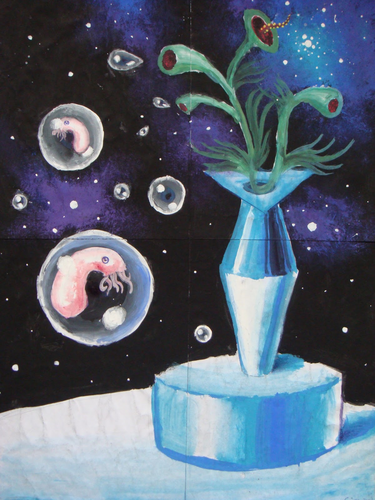 Desenul de mai sus si pictura de mai jos sunt doua creatii din liceu reprezentand o planta si niste animale extraterestre tinute undeva pe o nava cosmica in conditii de gravitatie 0. Planta dintr-o specie de pe alta planeta este tinuta intr-un vas special in care radacinile primesc apa si substante minerale, un fel de aparat care hraneste planta imitand conditiile din sol. Animalele sunt niste vietati subacvatice de mici dimensiuni prevazute cu tentacule care traiesc in apa care in lipsa gravitatiei formeaza sfere datorita fortelor de tensiune superficiala. Cand eram in liceu am visat intr-o dimineata ca aveam asemenea animale extraterestre in acvariu. Animalele masurau in jur de 25 cm si aveau un cap cu un creier foarte mare raportat la lungimea corpului, ochi albastrii si tentacule scurte in jurul gurii.