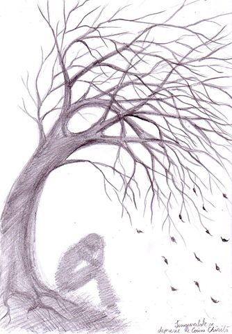 Tot azi am desenat si acest al doilea copac depresiv la care am adăugat si un om singur si trist ca o stafie ce sta fara speranța langa trunchiul copacului aproape uscat si plânge. Trist e copacul trist e si omul de langa el. Copacul negru si trist se agata de trecut cu rădăcinile sale iar ramurile descoperite in vânt lipsite de frunze si cocsate de viitorul nesigur se lasa in jos in timp ce ultimele frunze cad precum lacrimile in timp ce ființa umana isi acoperă fata neputând sa privească spre viitor si plânge. Singur e copacul, singur este si omul de langa el. Stau omul si copacul ca doua umbre negre singure si triste, cocosate de durere si fara curajul de a mai privi înainte.