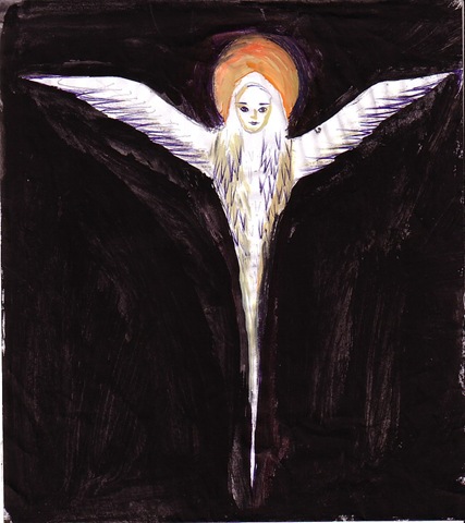 In toamna anului 2000 înainte sa mă îmbolnăvesc bunica mea a visat un înger care avea chipul meu si o aureola portocalie si o coada prelunga in loc de picioare si zbura. Am făcut aceasta pictura atunci după descrierile ei. La scurt timp după acest vis pentru ca mă durea piciorul stâng m-am dus la spital si am aflat ca am o tumora cu mieloplaxe. M-am operat pe 4 ianuarie 2001 si in februarie am făcut radioterapie din cauza căreia am făcut o arsura urata care s-a vindecat greu. Am fost imobilizata la pat cu piciorul in ghips 3 luni de zile. Din fericire tumoarea nu a recidivat dar si acum am rămas cu un semn acolo si piciorul este puțin deformat din cauza ca peroneul este mai scurt decat tibia. Bunica despre care vorbesc a murit in anul 2004