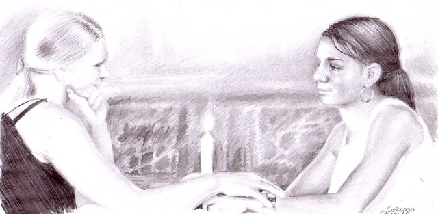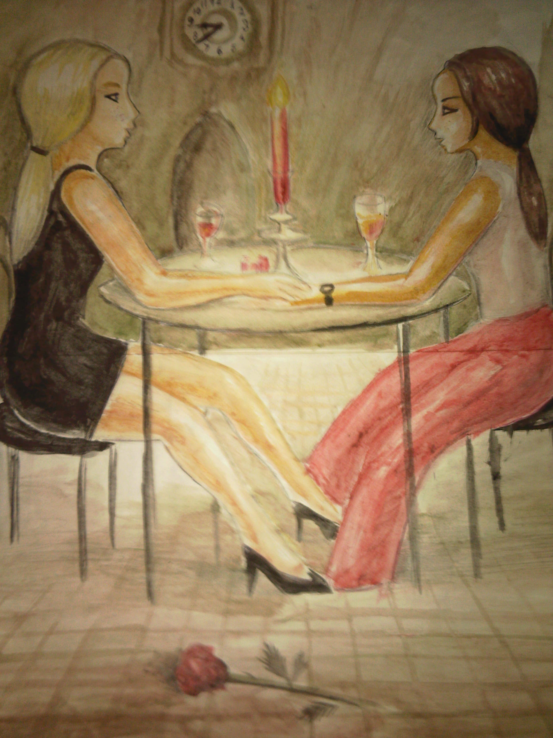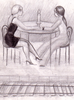 Personajele mele s-au întâlnit intr-o gara iar apoi au mers la o cafea. Ele stăteau la masa, fata in fata, privindu-se in ochi. Când una dintre ele a aprins lumânarea de pe masa cealaltă a atins timid mana ei fina. Ele se priveau in ochi, zâmbeau discret si mâinile lor se atingeau ușor caci sentimentele lor erau puternice.