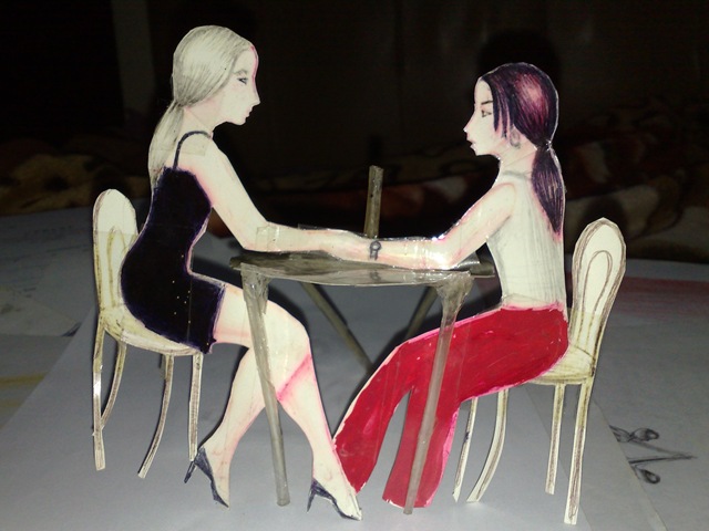 Doua fete stand la masa - o cina romantica Pr langa clasicele desene in creion tot atunci am făcut niște desene pe care le-am decupat si le-am pus la o masa făcuta tot din carton si scotch.