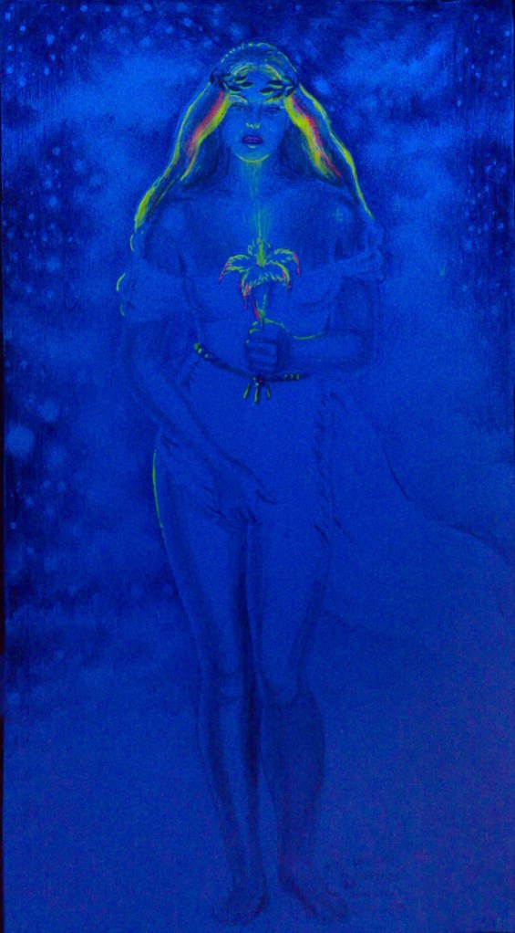 Acum cateva zile am imbunatatit desenul meu reprezentand-o pe fata cu parul de aur din poeziile lui Mihai Eminescu punand in evidenta crinul din mana ei si parul ei blond de inger cu ajutorul culorilor fluorescente l-am pus la lumina albastra a bradului de Craciun si l-am fotografiat. Cu ajutorul acestor culori fluorescente am reusit sa pun in evidenta crinul de lumina care lumineaza fata si parul muzei, asa cum descrie si poetul in versurile poeziei „Aveam o muza”