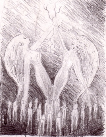 Acesta este un desen in creion iar mai jos este o pictura reprezentand doua spirite indragostite ce se contopesc precum fumul lumanarilor ce au fost folosite pentru a le chema, doua energii ce se unesc, doua spirite fara trup si fara sexe, doar energie pura.