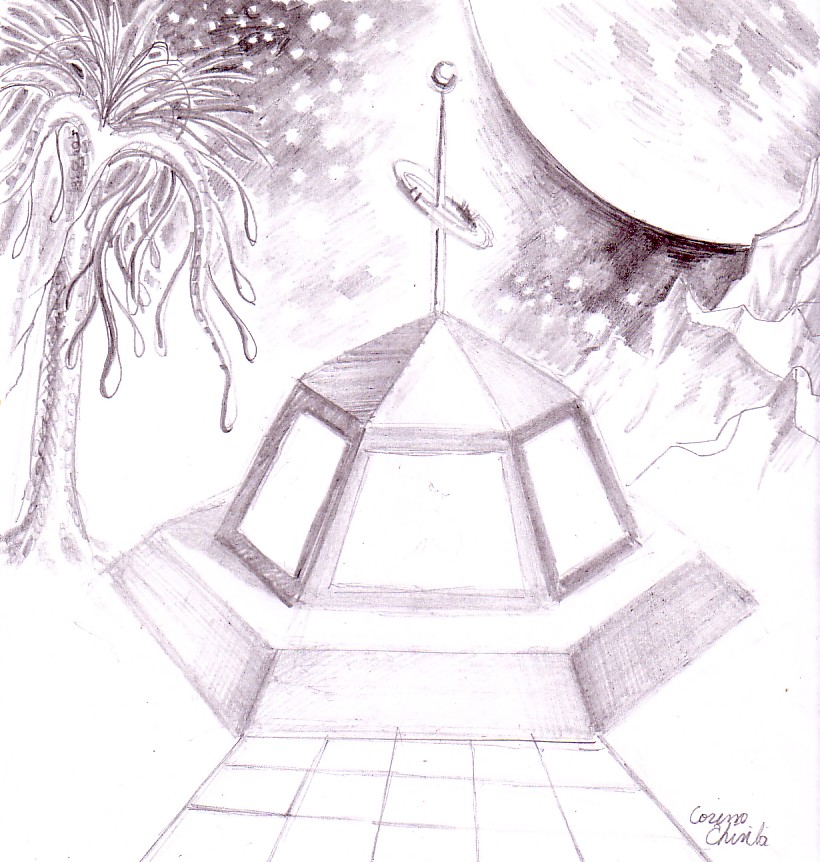 Am desenat aceasta constructie de pe o planeta unde exista forme inteligente de viata si o civilizatie mai avansata decat a noastra cu ceva timp in urma. Constructia este compusa din doua trunchiuri de piramida si o piramida hexagonala si are o antena in varf