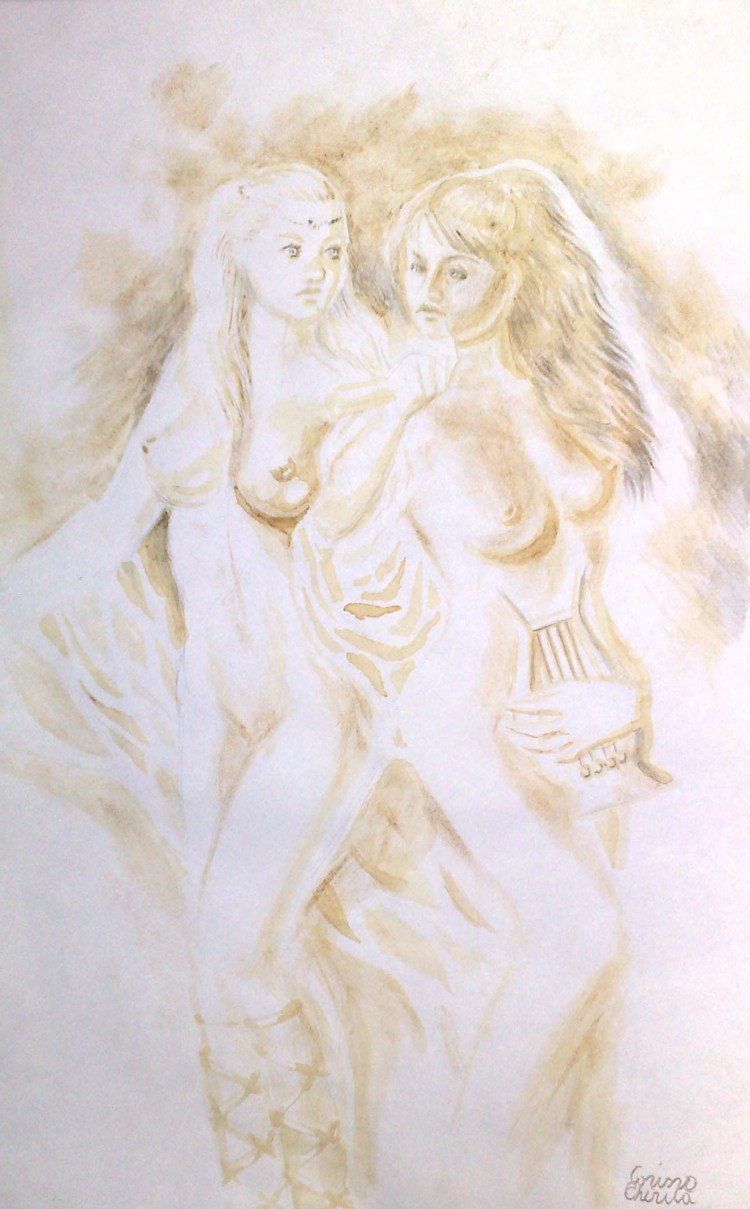 Sappho si una dintre fetele de pe insula Lesbos, pictura facuta cu cafea