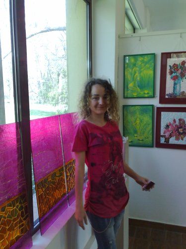 Eu cu lucrarile mele expuse alaturi de cateva tablouri facute cu coji de ou si vitraliile si sculpturile lui Mihai Boroiu