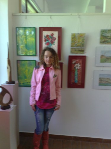 Corina Chirila cu tablourile expuse in Herastrau la salonul de primavara