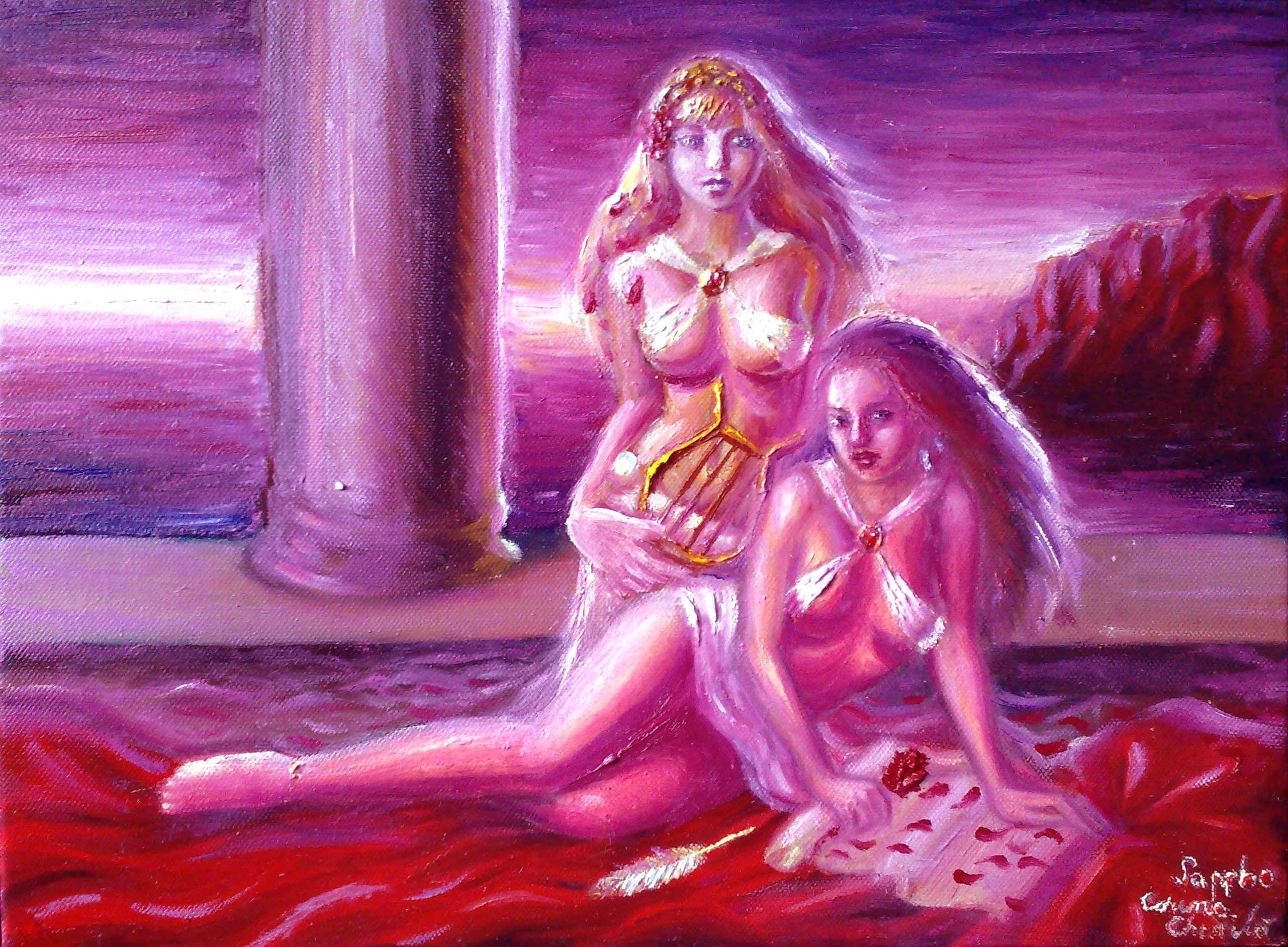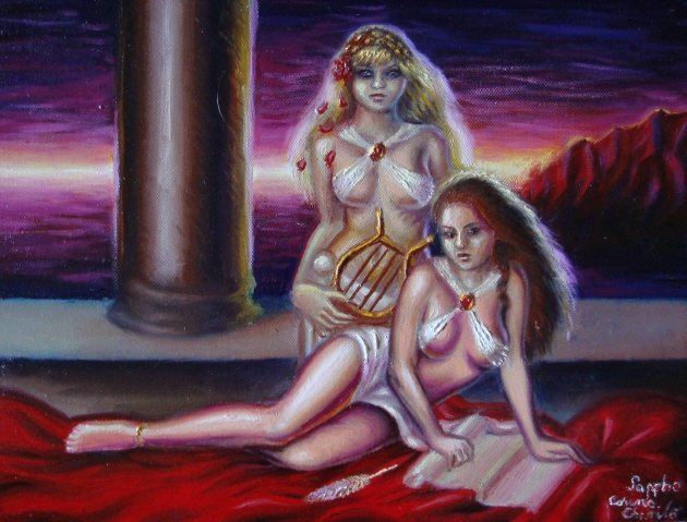 Ieri uitandu-ma pe tabloul meu in ulei pe panza reprezentand-o pe poeta Sappho (bruneta) alaturi de Gongyla, o fata careia aceasta i-a dedicat o poezie, am costatat ca acesta se ingalbenise din cauza vernisului italian pe care l-am folosit si capatase un aspect intunecat si a trebuit sa modific pictura, facand-o mult mai luminoasa, chiar mai luminoasa decat a fost atunci cand am facut-o.