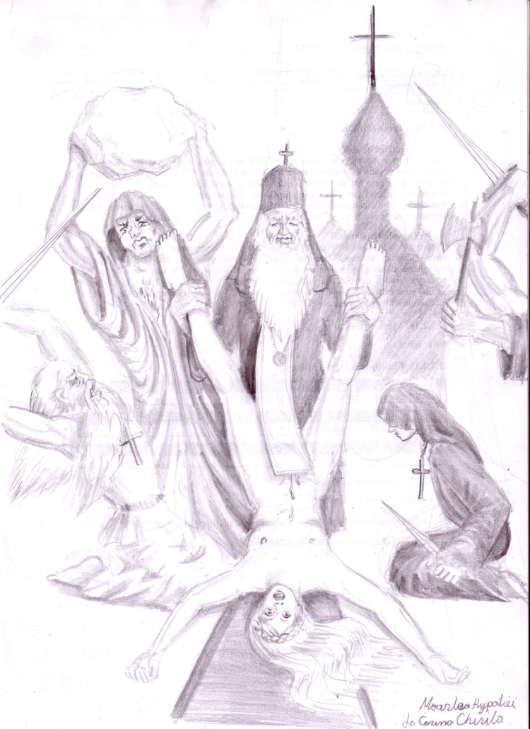 Desi este plin de violenta si ar putea fi considerat ofensator desenul de mai sus prezintă o realitate cruda, felul in care a murit o femeie de geniu, filosoafa si matematiciana Hypatia, ucisa cu sange rece de creștinii conduși de sfântul Kiril. Nu vreau sa ofensez pe nimeni dar asta e adevarul, astea sunt faptele istorice care nu pot fi negate.