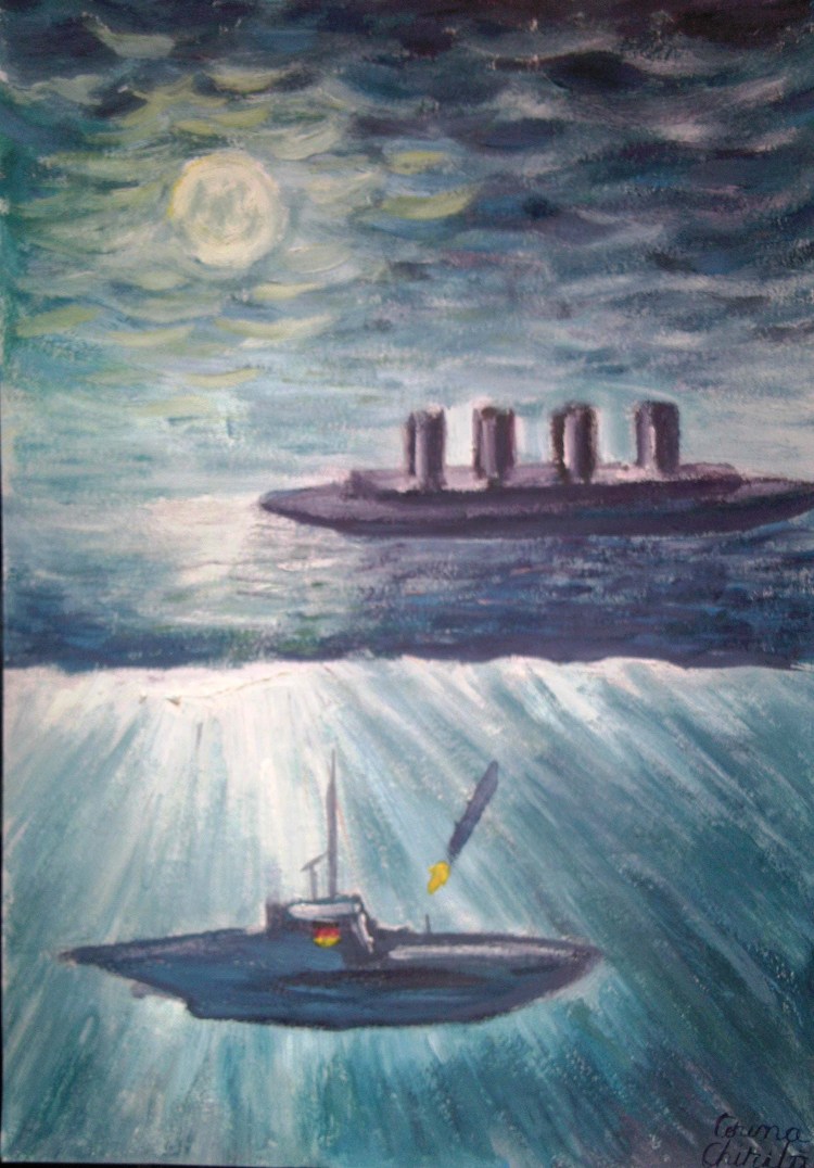 In imaginea de mai sus este o pictura pe care am facut-o azi cu Titanicul si „icebergul” german ce pandea ca un monstru din adancuri si lansa torpile