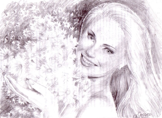 Fata cu flori desen in creion