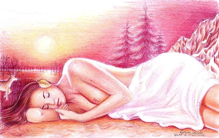 Azi am facut un tablou inspiat din poezia Vara de noiembrie de Lucian Blaga pornind de la desenul de ieri. Asa mi-o imaginez eu pe muza adormita a poetului in decorul montan descris in poezie, visand in lumina diminetii. Atat de frumoase sunt femeile cand dorm iar peisajul linistitor de munte se armonizeaza foarte bine cu somnul muzei poetului