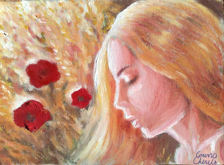 Azi folosind doua bucati de carton de 18×14 cm de la o cutie de cereale am facut picturile de mai sus. Pur si simplu am pictat ce mi-a venit lasand pensula sa se joace libera pe carton. Nu am avut o idee in minte, doar am pictat foarte repede fara sa ma gandesc la o anumita imagine. Asa au luat nastere aceste doua portrete, aceste doua chipuri curate de fata intr-un decor natural, plin de viata si de prospetime, inconjurate de flori si spice de grau, doua chipuri ce emana puritate, prospetime si naturalete.