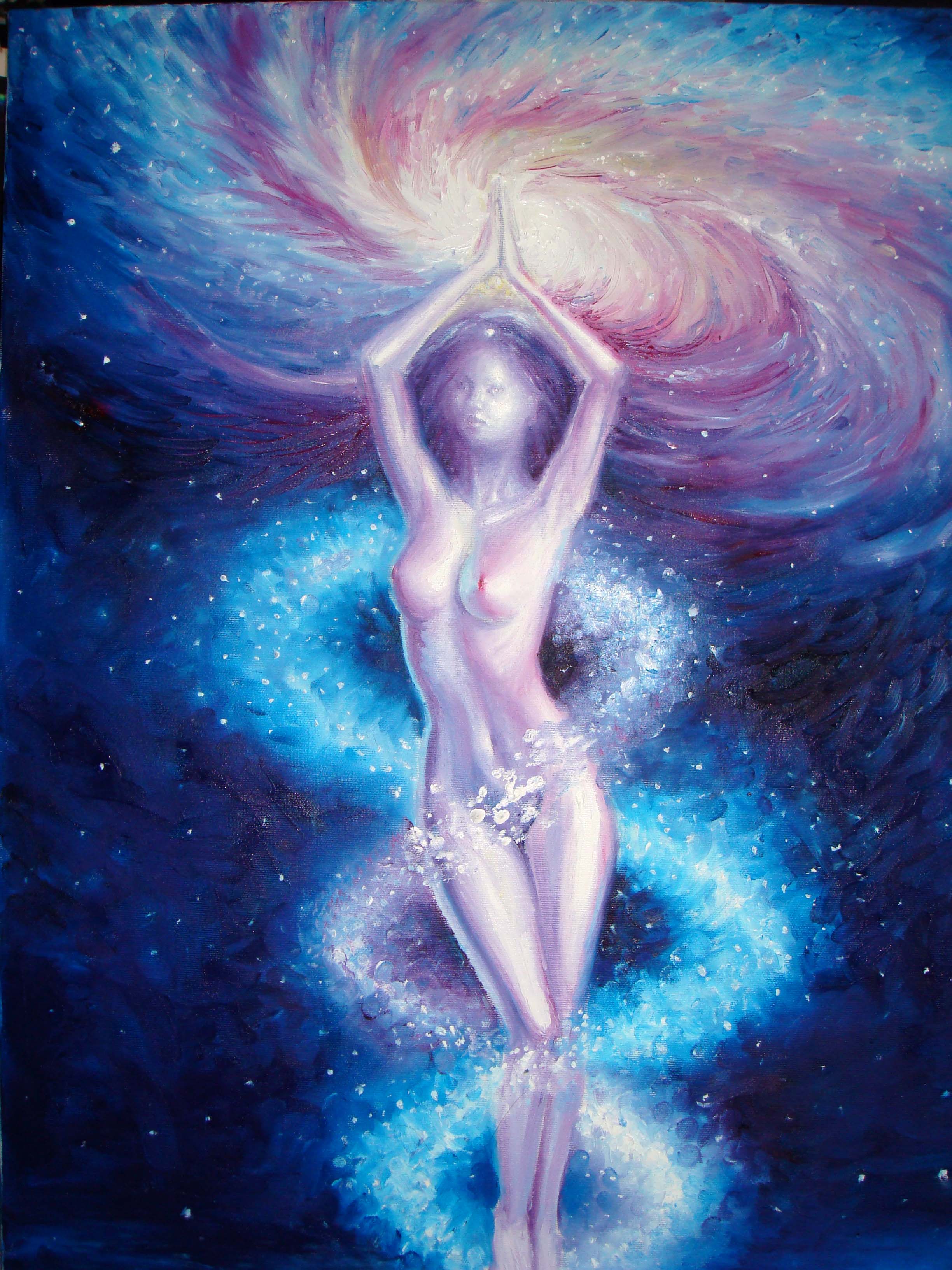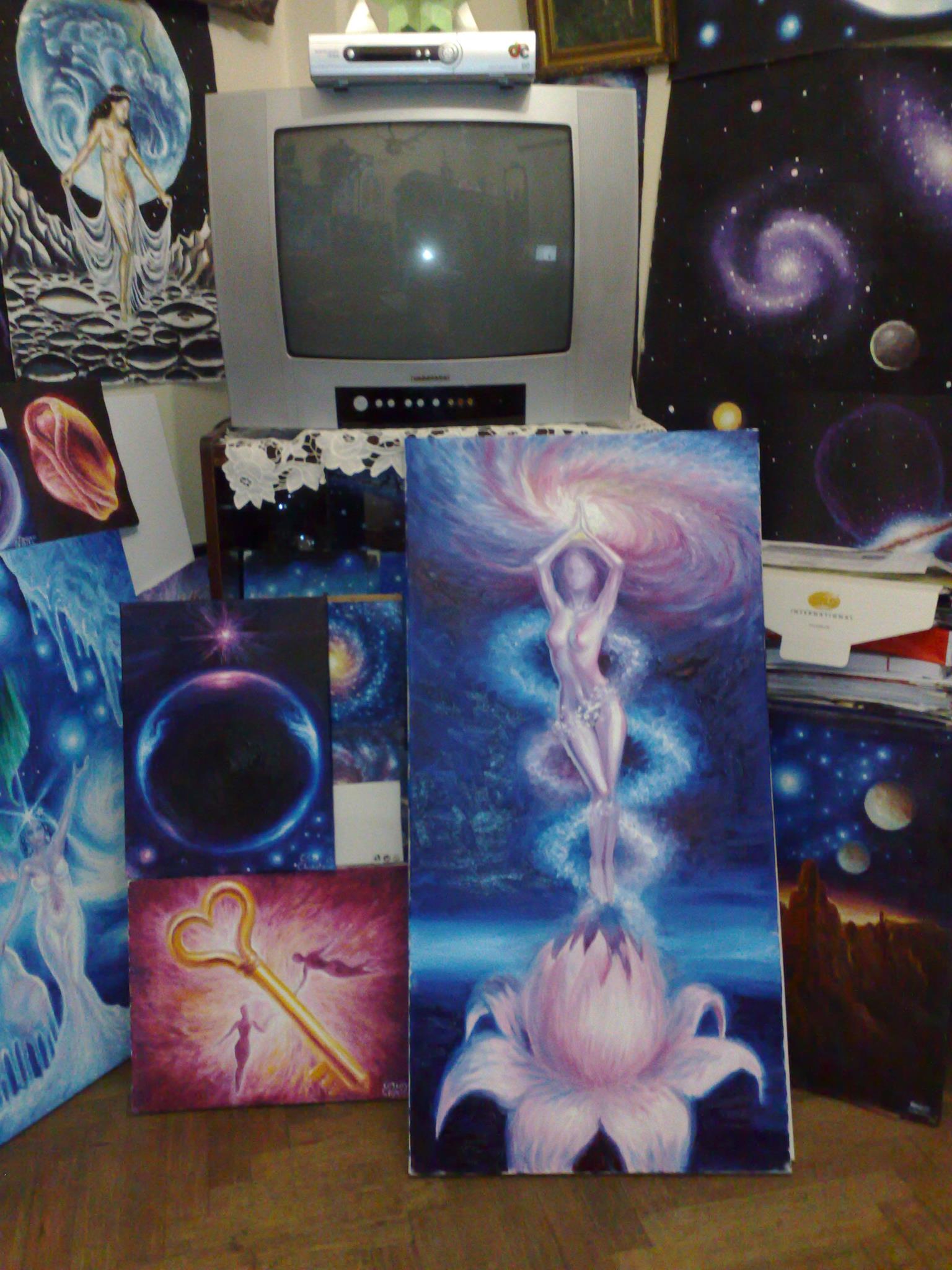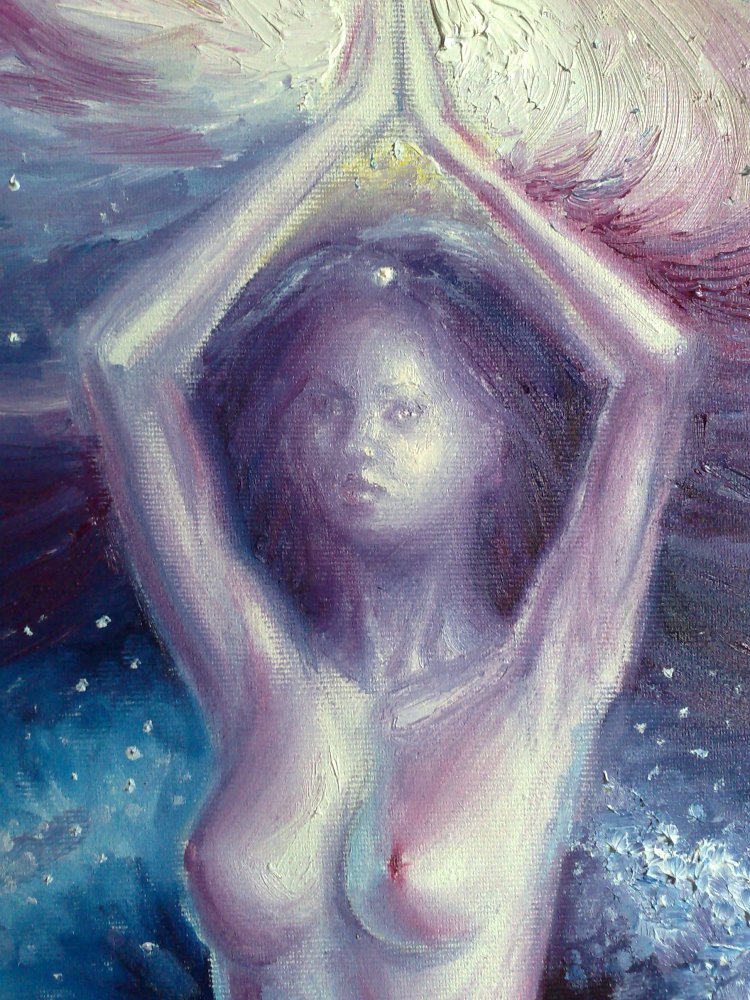 La o saptamana dupa ce l-am pictat chipul fetei din tabloul de mai sus a inceput sa se intunece capatand o culoare gri-albastruie mortuara, o culoare ce amintea de un cadavru care s-a invinetit si intra in putrefactie, probabil din cauza ca albul pe care l-am folosit continea alb de zinc. De cand am inceput sa lucrez la tabloul asta ceva ciudat se tot intampla cu chipul fetei. Initial am incercat sa o fac cu capul putin dat pe spate, privind in sus, spre galaxie, dar mi-a iesit foarte grosolana si vanata in jurul ochilor si am sters totul si am luat-o de la capat cu chipul. Pe cat incercam eu sa o fac de draguta pe atat de sinistra imi iesea ca si cum colurile ar fi avut o inteligenta a lor. Prima data culorile s-au amestecat pe panza in asa fel incat privita de la distanta fata mea semana mai mult cu o femeie foarte batrana iar cand am incercat sa o corectez capul a inceput sa semene tot mai mult cu un cap de mort.