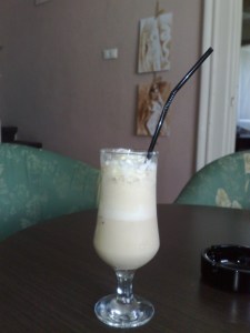 Un frappe racoritor cu vanilie si picturi facute cu cafea expuse la Home Cafe