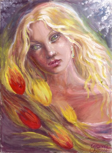 Fata cu lalele pictura tempera – Girl with tulips tempera painting
