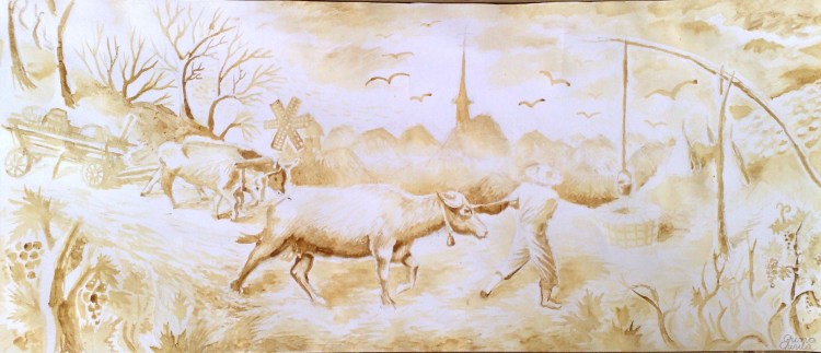 Anul acesta salonul de toamna organizat de Asociatia Artistilor Plastici din Bucuresti la galeria AAP din Herastrau are ca tema „Toamna satului romanesc”. Recunosc ca datorita faptului ca nu am abordat deloc acest subiect pana acum a durat destul de mult pana mi-a venit inspiratia. In aceasta dimineata, folosind doar cafea, am facut tabloul de mai sus. Tabloul va fi expus la galeria AAP din Herastrau incepand cu 21 septembrie