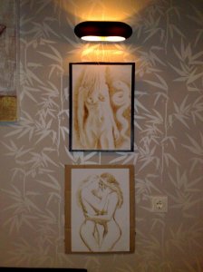 Nuduri pictate cu cafea la expozitie la cafeneaua Harley Cafe