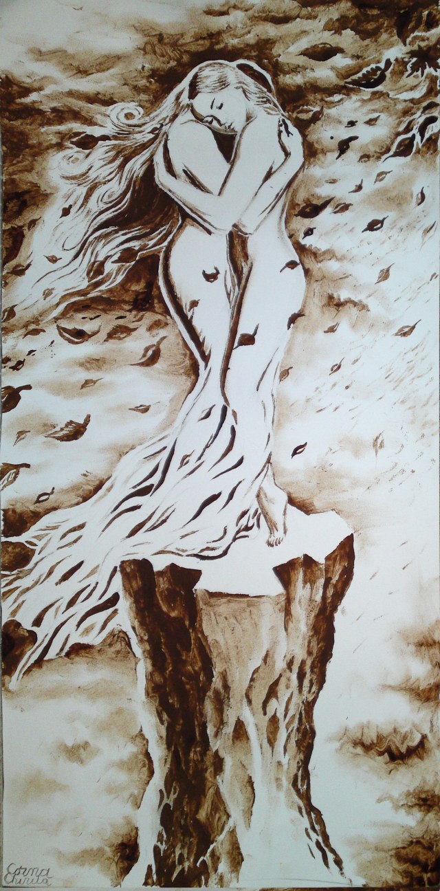 Aceasta pictura pe care am facut-o azi folosind cafea si cacao reflecta o imagine din mintea mea, un gand si un sentiment pe care l-am trait, doua femei imbratisate in bataia vantului de toamna, atat de firave, atat de singure, sub un cer intunecat de nori. Toata natura, totul in jur e impotriva lor, pamantul crapa si le fuge de sub picioare iar ele stau una in bratele celeilalte si nimic nu le poate desparti pentru ca se iubesc.