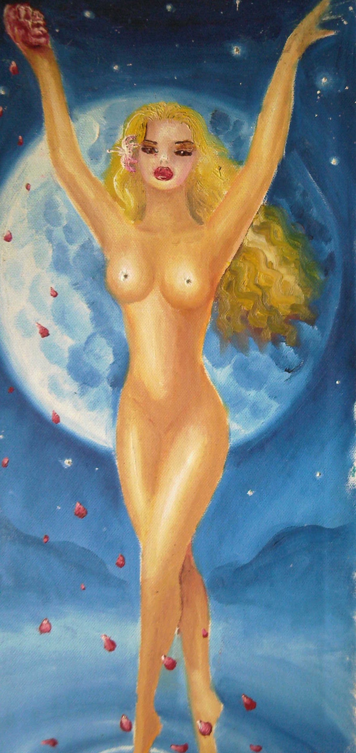 O fata blonda dansand goala si aruncand trandafiri in lumina lunii