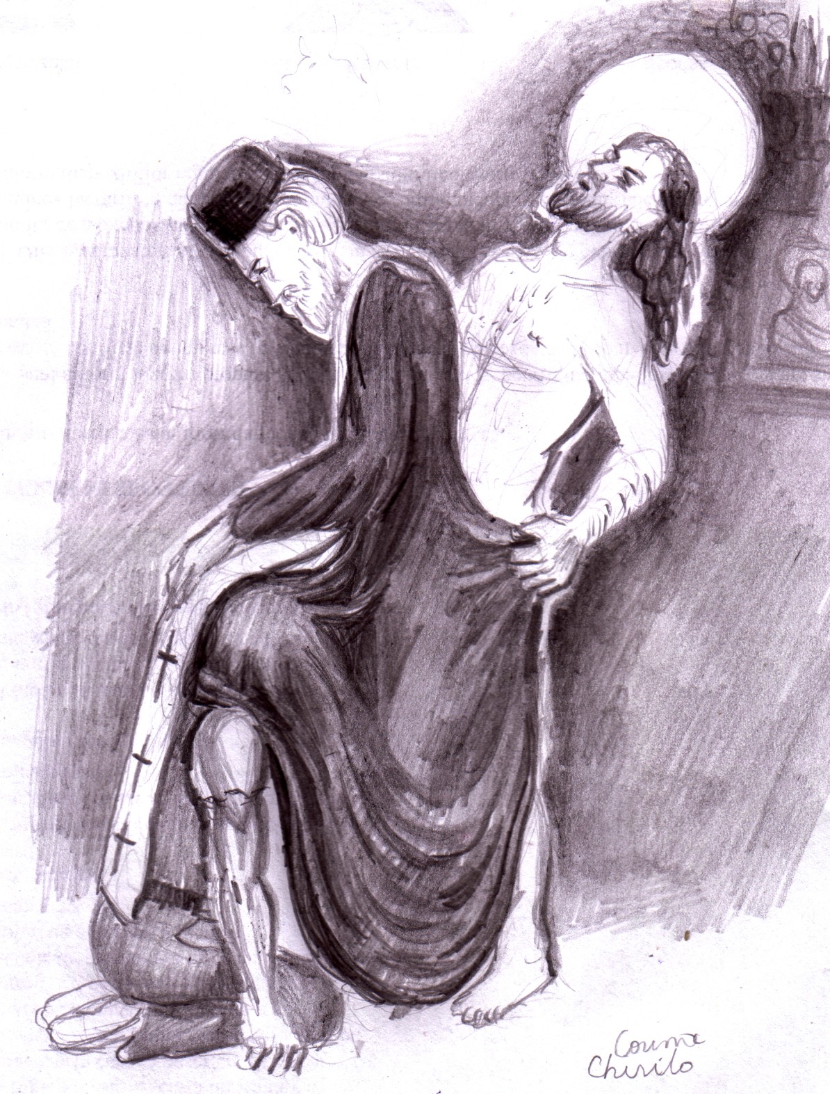 Continuand seria de desene cu teme religioase azi am desenat un preot, un credincios care isi marturiseste pacatele cu capul bine asuns sub haina sfanta, asa cum se obisnuieste in ortodoxie, si pe Iisus Hristos aparand ca o fantoma in spatele preotului. Acest desen reprezinta viziunea crestina asupra preotilor care sunt vazuti ca mediatori intre om si Dumnezeu. Din cate stiu eu oamenii si-au ales preotii, biserica fiind o institutie condusa, organizata si administrata de oameni, asa cum si biblia tot de oameni a fost scrisa. Din cate stiu eu niciodata nu a venit Dumnezeu sa ne numeasca preotii sau sa ne spuna ce sa facem si nu exista manifestari obiective ale divinitatii. Concluzia este ca omul l-a creat pe Dumnezeu nu invers.