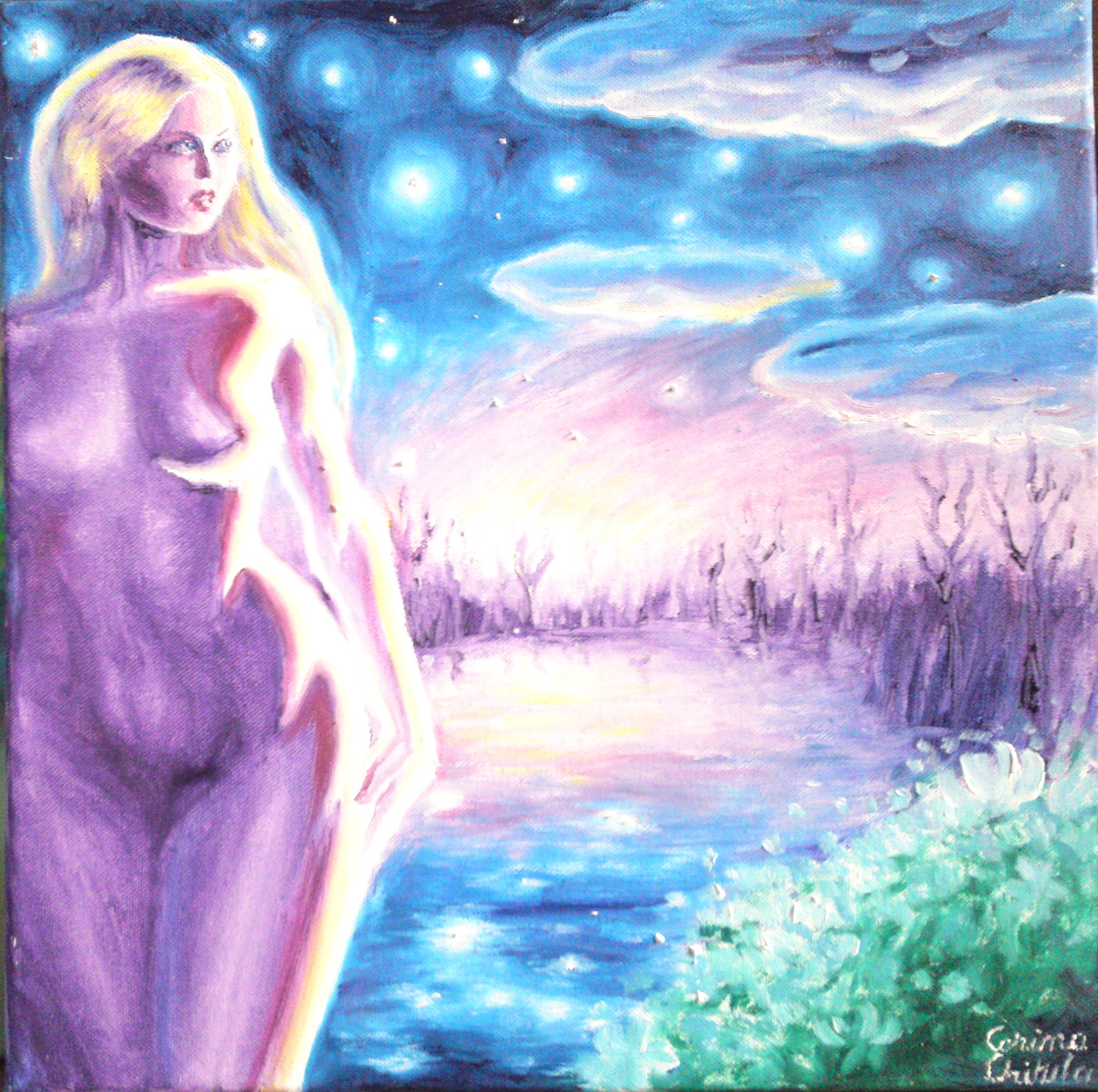 Dupa cum am promis, am facut si o pictura in ulei pe panza inspirata din poezia „Din Cerurile-albastre” de Mihai Eminescu, o pictura prin care am pus in avidenta atat lumina albastra a luceferilor si codrul reflectandu-se in oglinda lacului cat si frumusetea muzei lui Eminescu, nu Veronica Micle ci copila cu parul de aur cu care adolescentul Eminescu se plimba prin codrul fermecat pana la lacul despre care a scris si in poezia „Lacul”, prima si marea iubire a lui Eminescu „floarea albastra”, „dulcea minune” care a murit la doar 19 ani lasand un gol imens in sufletul poetului. Mai jos este poezia „Din cerurile-albastre”