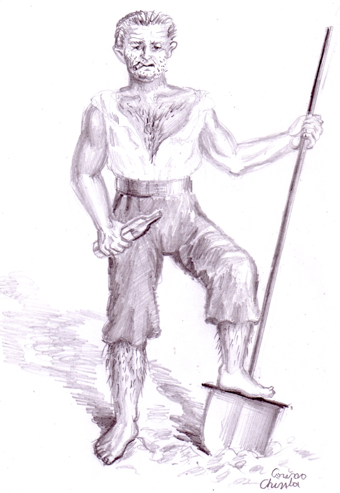 Am facut acest desen in creion azi. Ideea mi-a venit dupa ce am fost la Muzeul Taranului Roman si dupa ce am citit romanul Ion de Liviu Rebreanu. Acesta este taranul roman si est european tipic la sapa, cu tigarea fumegand in coltul gurii si cu sticla de bautura la el, taranul care cand vine acasa dupa o zi de munca la camp isi bate nevasta si copiii pentru ca vorba lui „bataia este rupta din rai” (da, este rupta din rai pentru ca nu avea ce cauta acolo si un Dumnezeu sadic a aruncat-o ca pe o masea stricata la oameni pentru ca nu avea ce cauta in rai), este grosolan si agresiv si ii judeca mereu pe altii fara sa se uite la propriile defecte, nu a citit decat o singura carte in viata lui si anume biblia (in cazul fericit in care stie sa citeasca) si in fiecare duminica este prezent la slujba la biserica din sat, fiind indoctrinat de ortodoxie pana in maduva oaselor.