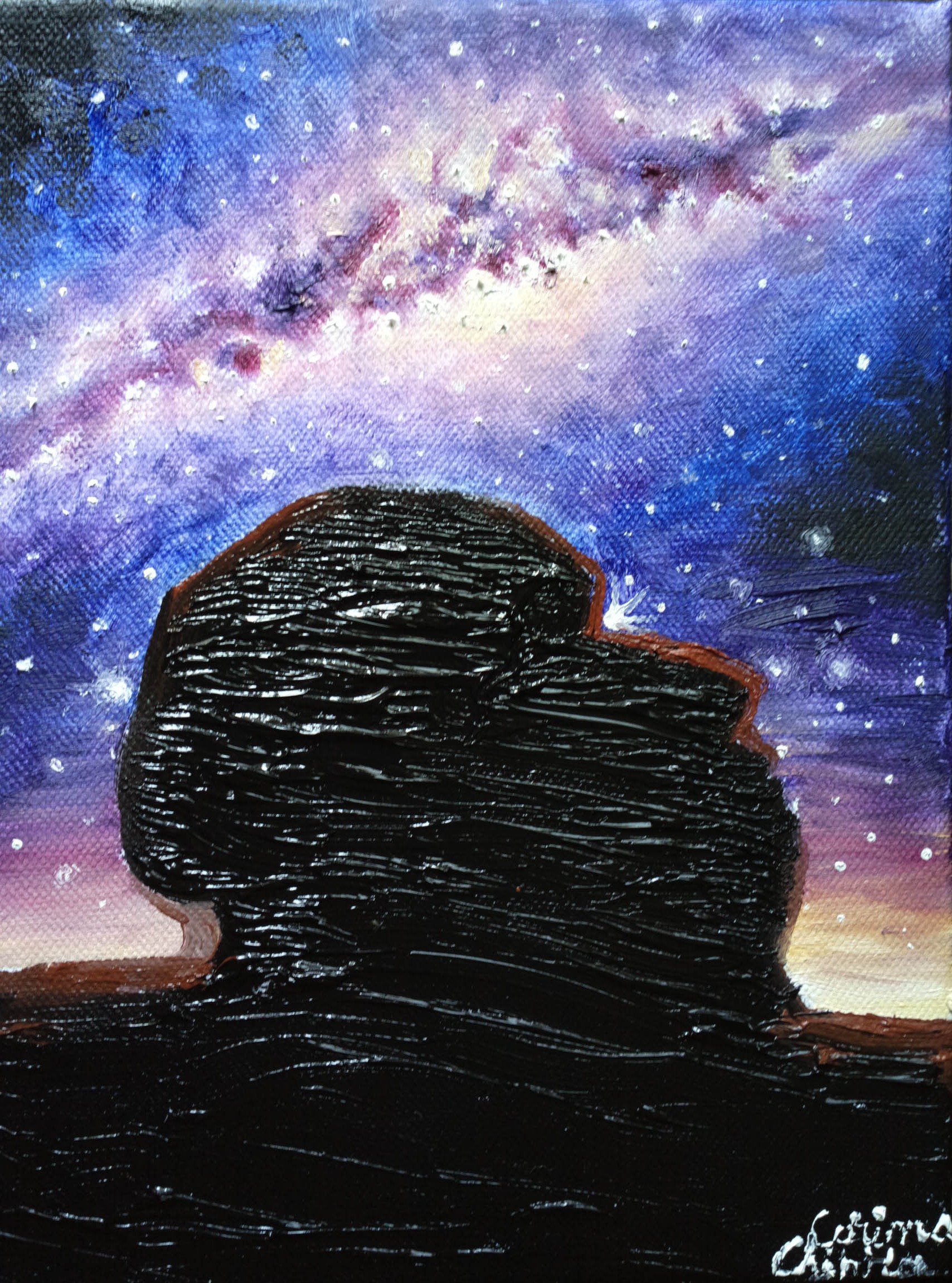 Inspirata de drumetiile montane din aceasta vara am facut pictura in ulei pe panza de mai sus. Pe 17 august am fost pentru prima oara in viata mea la Varful Omu si am descoperit ca si acolo exista un al doilea sfinx din Bucegi. Mai putin cunoscut decat cel de la Babele, sfinxul de la Omu seamana foarte mult cu cel de pe Marte, avand privirea indreptata spre cer, spre Calea Lactee. Din pictura mea lipseste cabana pentru ca am surprins sfinxul intr-un alt timp, mai aproape de vremurile cand a fost creat