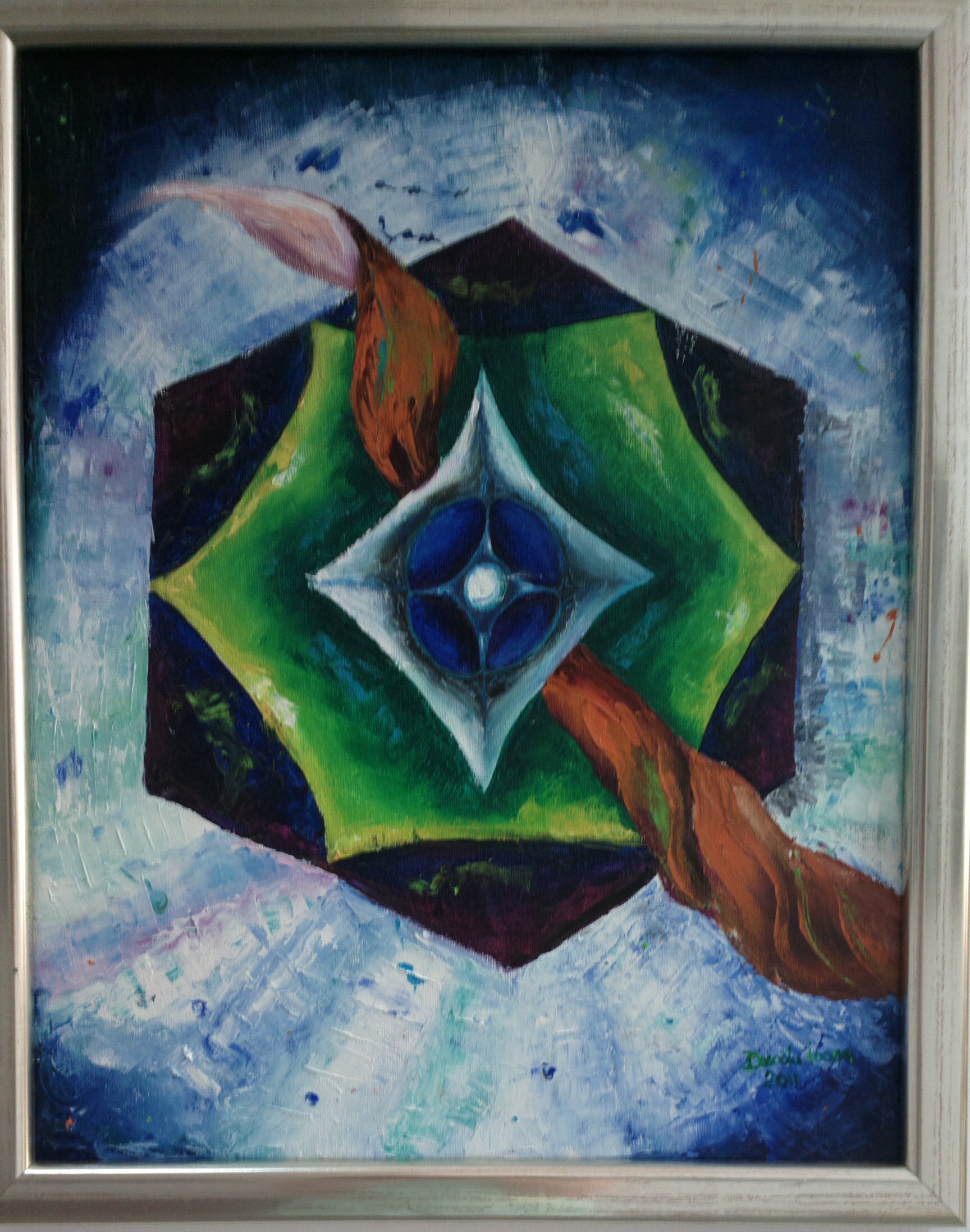 Înspăimântător si fascinant in acelasi timp, necunoscutul ne atrage si ne îndeamnă sa-l exploram macar cu mintea. Tabloul de mai sus, creatia Ioanei Dascalu, este intitulat „Privire spre necunoscut” si este o pictura abstracta. Privind acest tablou eu vad in el un icosaedru in interiorul caruia exista un dodecaedru si un octaedru (3 dintre cele 5 poliedre regulate) si sfera inscrisa in ele, avand in centru o forma misterioasa de energie, energia pe care piramidele tip Keops o concentraza la 2 treimi de varf si o treime de baza.