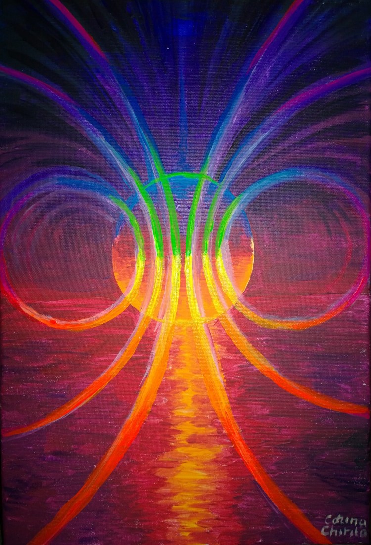 Intre 7 si 12 august am fost la Costinestisi am vazut obeliscul, simbolul statiunii. Mi-a atras atentia asemanarea dintre acest obelisc si liniile campului magnetic si fiind inspirata atat de forma obeliscului, cat si de liniile campului magnetic am facut pictura de mai sus si desenul de mai jos.
