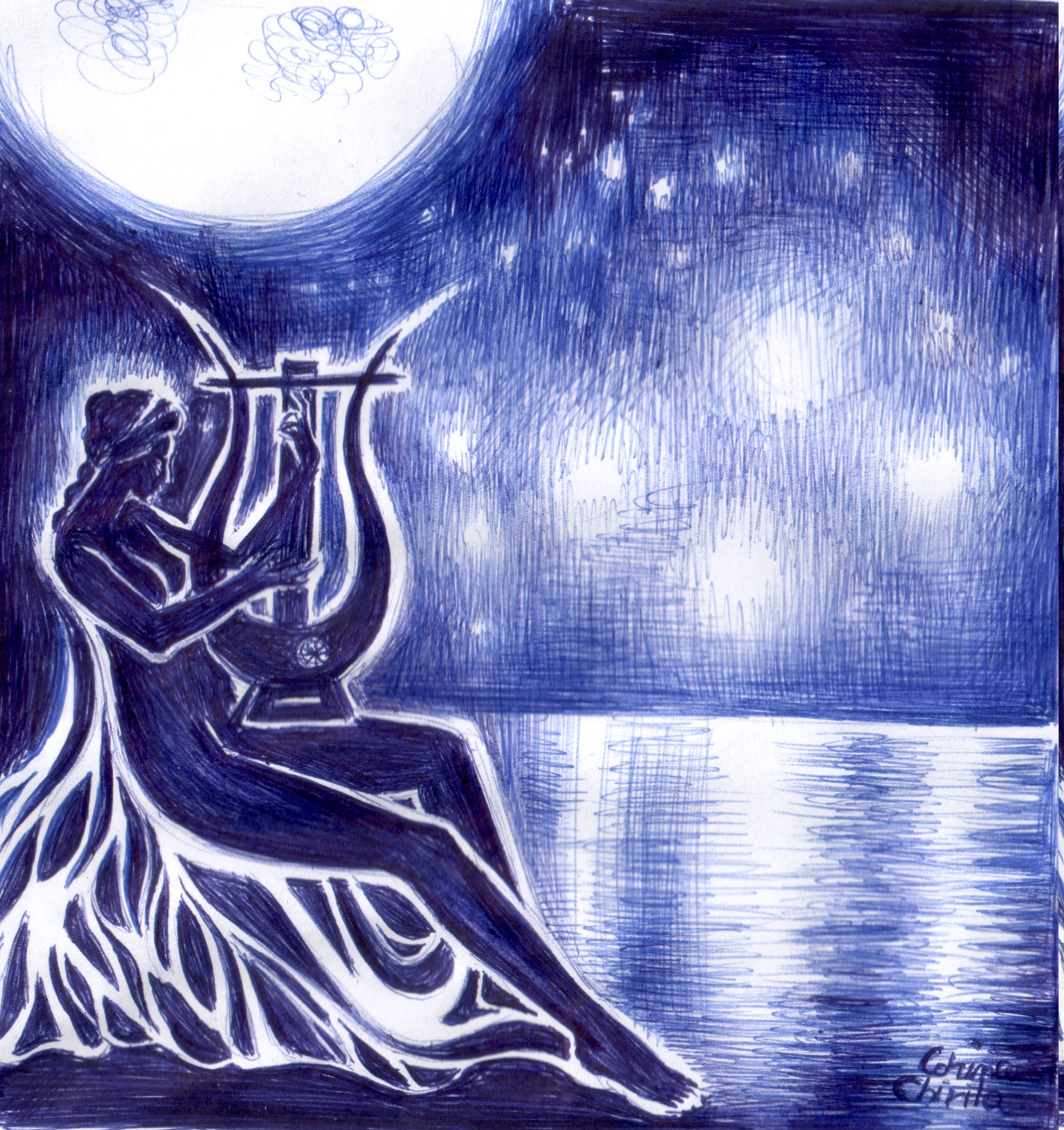 Sappho cu lira ei si Pleiadele, desen facut cu pixul