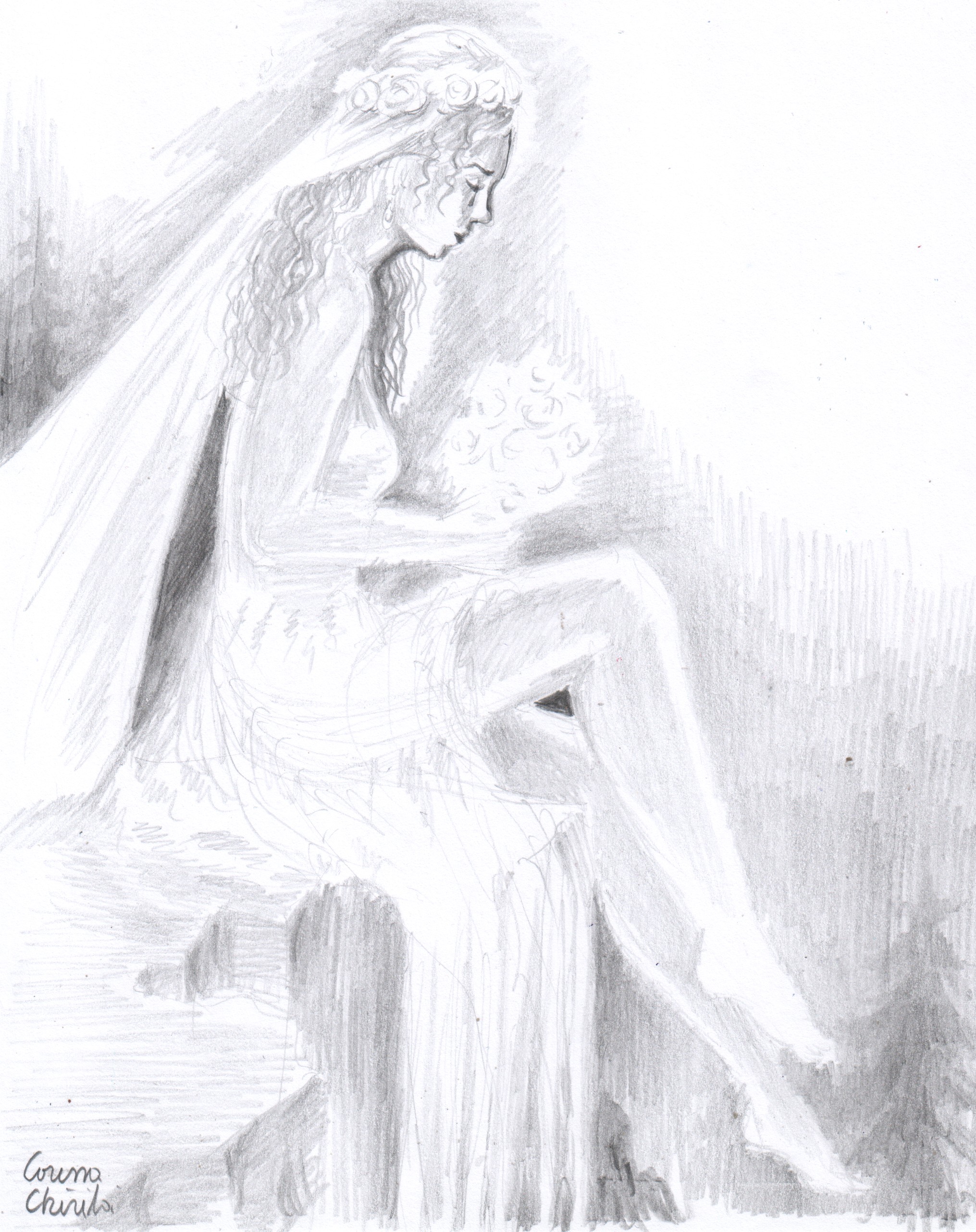 Legenda cascadei Valul Miresei – sinuciderea unei mirese nefericite desen in creion