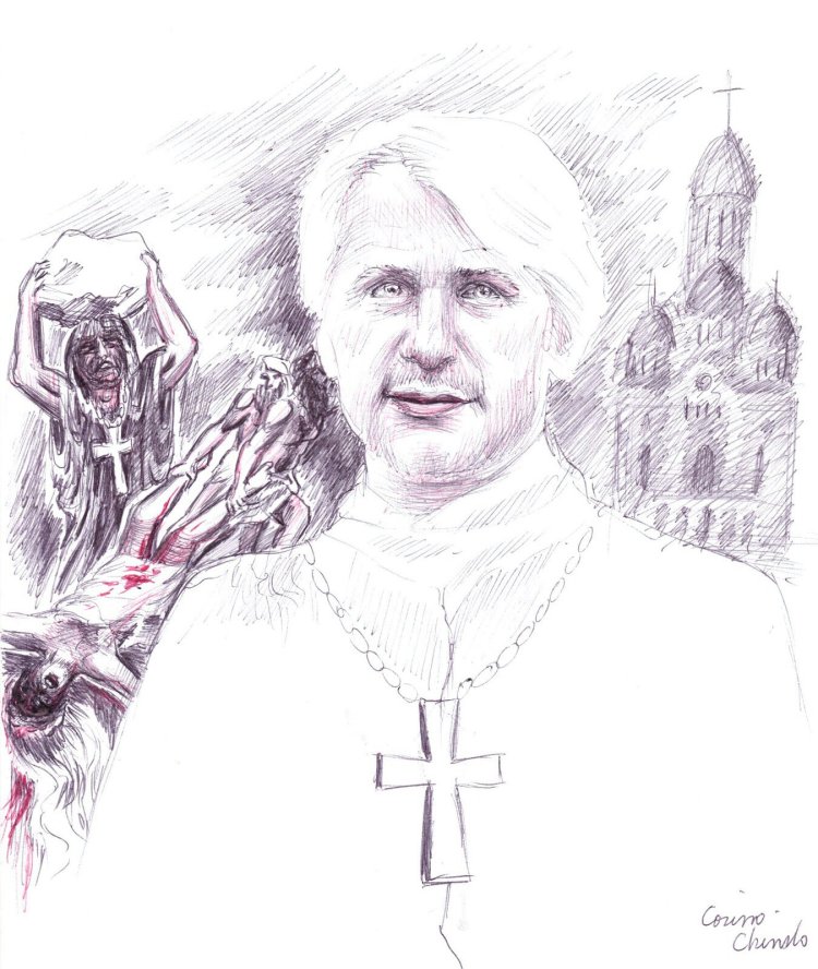 In desenul meu Eugen Teodorovici este marele inchizitor, iar in spate e intr-o parte chiar Hypatia, simbolizand stiinta romaneasca, batjocorita in toate felurile, violata, masacrata, facuta bucati si redusa la tacere de niste idioti misologi si ignoranti, iar in partea cealalta, ca o pula cu doua coaie sau ca un mare cacat cu mot, catedrala mantuirii neamului.