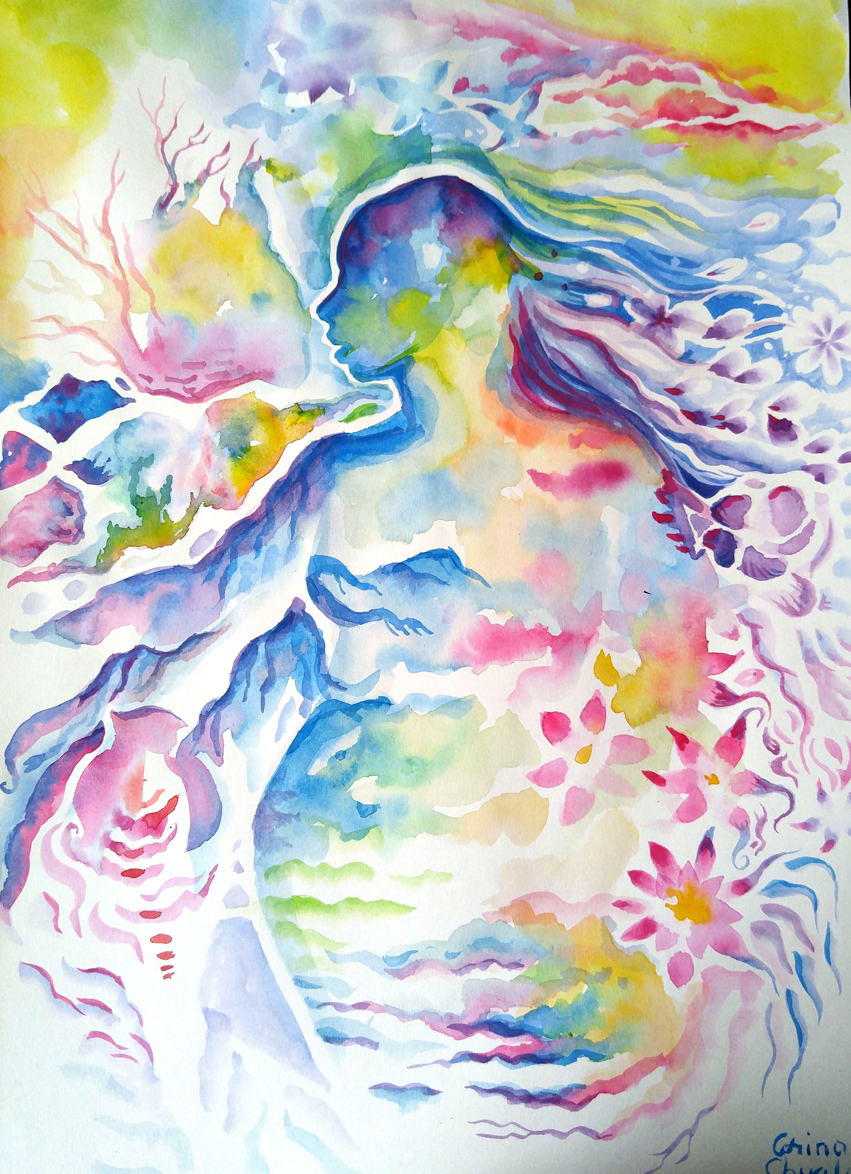 Pictura acuarela silueta de femeie flori munti forme – Watercolor painting