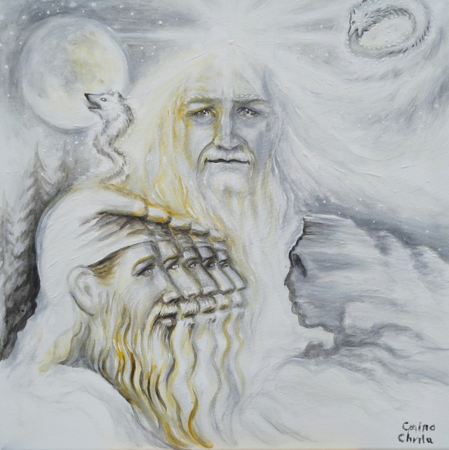 Zamolxis sfinxul din Bucegi lupul dacic si dacii tarabostes pictura in acrilice pe panza facuta la Targul National de Turism de la Romexpo