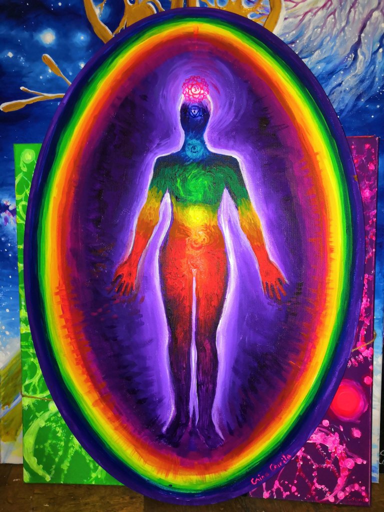 Zilele trecute am cumparat o panza ovala si m-am gandit sa pictez corpul energetic uman pe ea. Rezultatul se vede in imagine