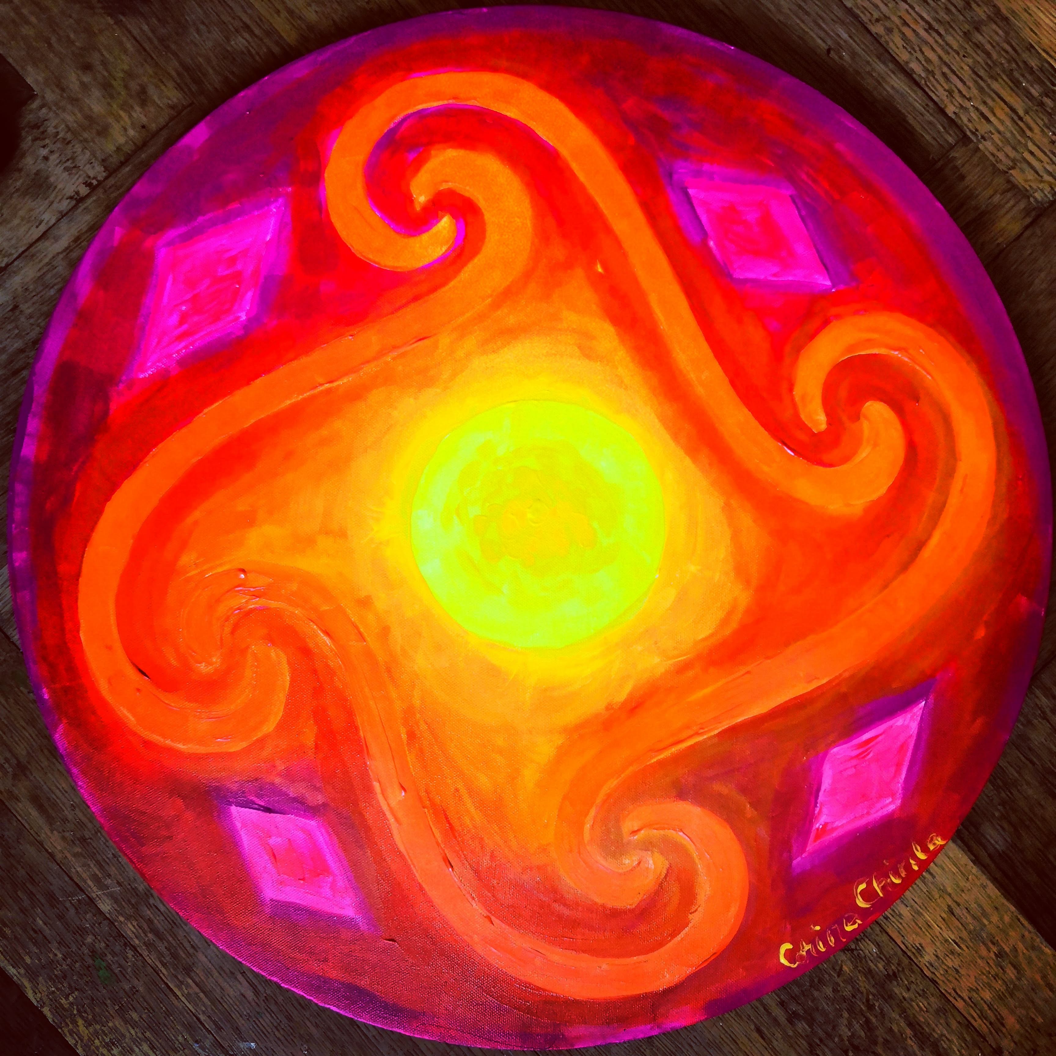 Am facut pictura fluorescenta de mai sus pornind de la un simbol stravechi, un simbol solar pe care dacii l-au preluat de la inaintasii lor, o mandala compusa din spirale ce simbolizeaza continuitatea vietii sub acelasi soare. Simbolul este foarte vechi, fiind prezent si pe diverse obiecte care au fost create acum 7000 de ani de popoarele care au dezvoltat primele civilizatii de pe planeta asta. Da, primele civilizatii de pe Pamant au fost aici, pe teritoriul Romaniei.