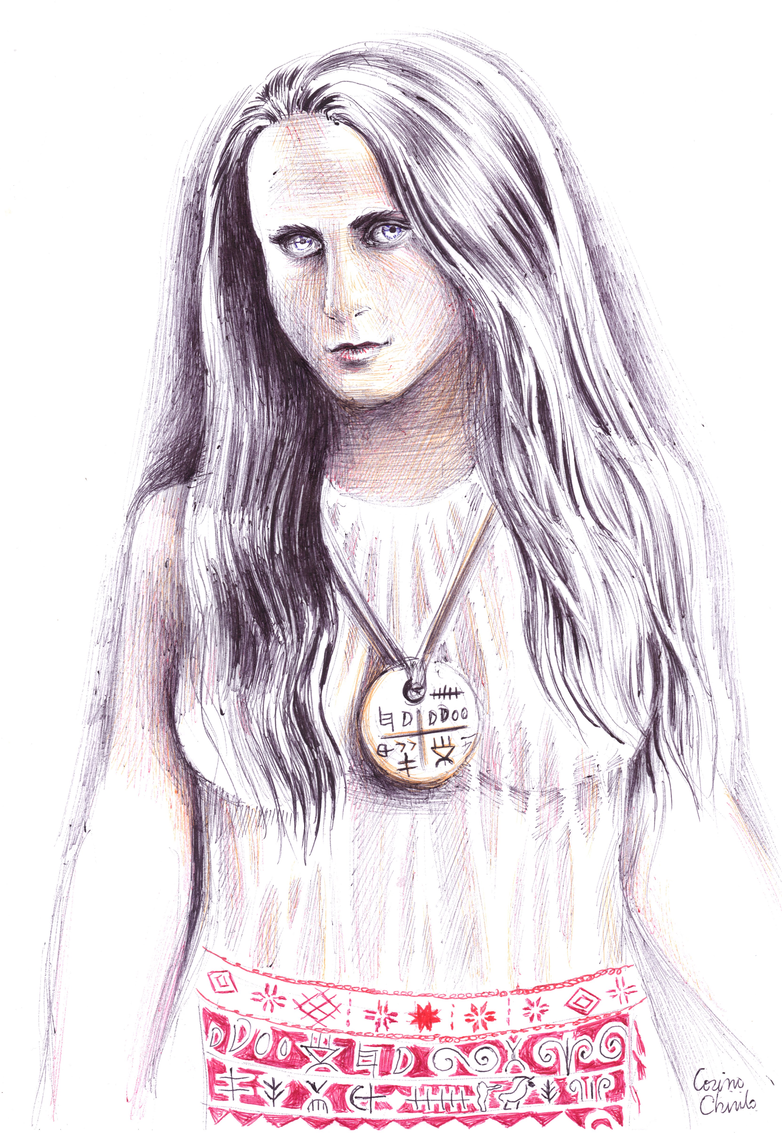 Aceasta femeie pe care am desenat-o chiar azi a trait acum 7000 de ani si a fost o mare preoteasa. Pandantivul pe care il poarta a fost ingropat odata cu ea si a fost gasit la Tartaria. Pe acest pandantiv din piatra a ramas ceea ce noi in ziua de astazi cunoastem ca fiind cea mai veche scriere din lume. O scriere despre cer si pamant, soare si luna si fazele ciclului menstrual coroborate cu fazele lunii.