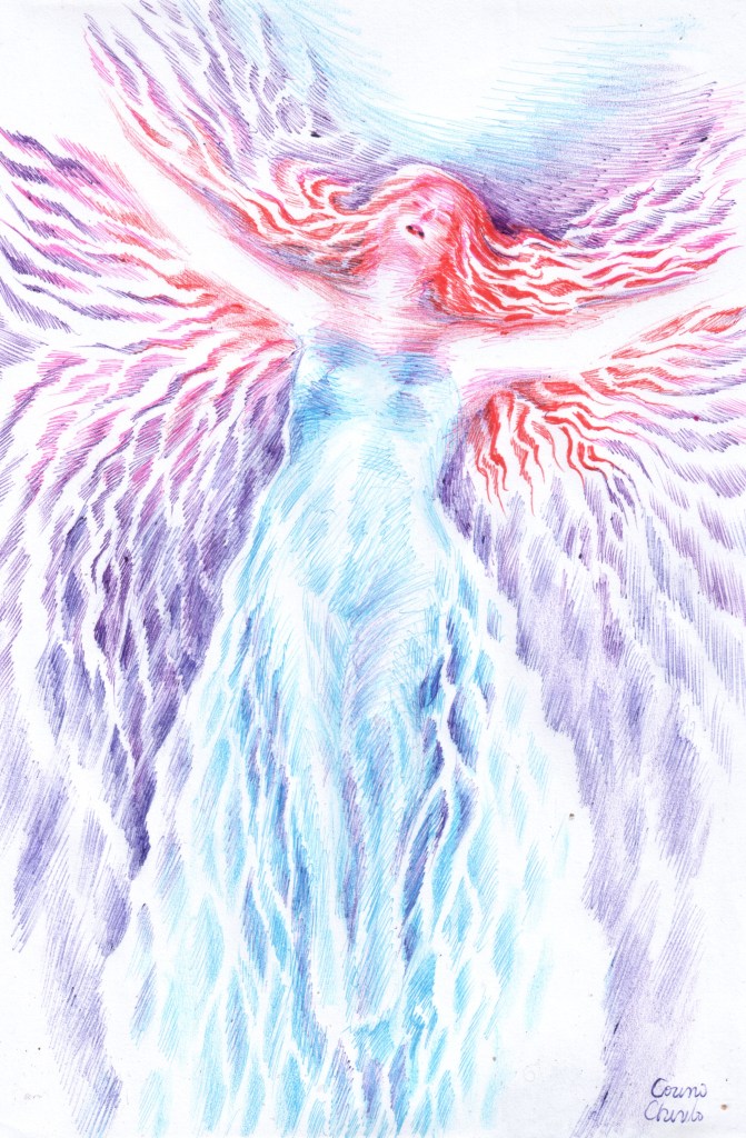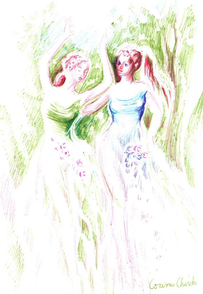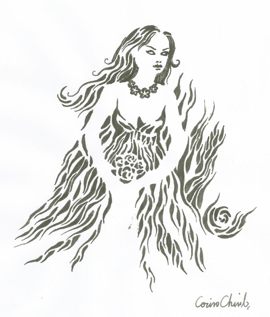 Zana primaverii intr-o rochie albastra, eleganta, desen facut cu pixul