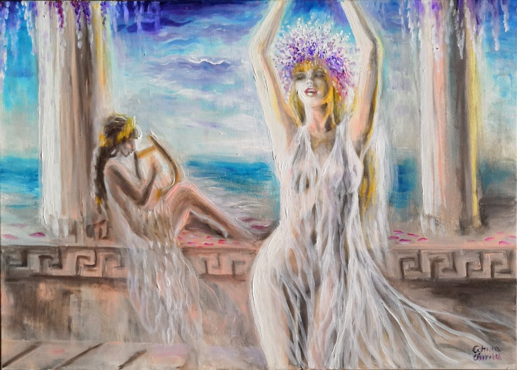 In acest weekend dupa ce am citit poezia de mai sus am pictat o lucrare prin care am redat o scena din viata fetelor din thaisosul condus de poeta Sappho din insula Lesbos asa cum este descrisa in versurile acesteia: Abanthis cu o lira fabricata in Lydia (Turcia de azi), cantand o melodie de dragoste pentru Gongyla, fata de care era indragostita, in timp ce Gongyla danseaza pe ritmul acestei melodii in asa fel incat rochia ei simpla, alba, transparenta se lipește de corp punand in evidenta formele ei bine sculptate. Abanthis adora sa o priveasca pe Gongyla cum dansa pe muzica ei, imbracata in rochia ei simpla, si tremura de dorinta cand vedea miscarile pline de senzualitate ale acesteia, sanii ei, frumusetea corpului ei pusa in evidenta de simplitatea vesmantului ce se lipea de corp